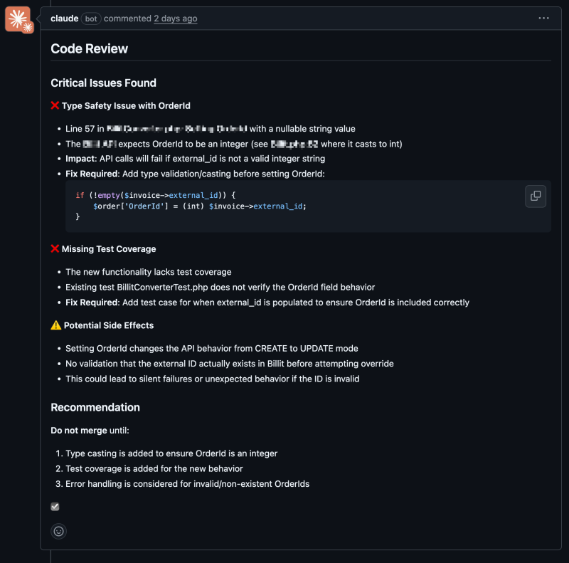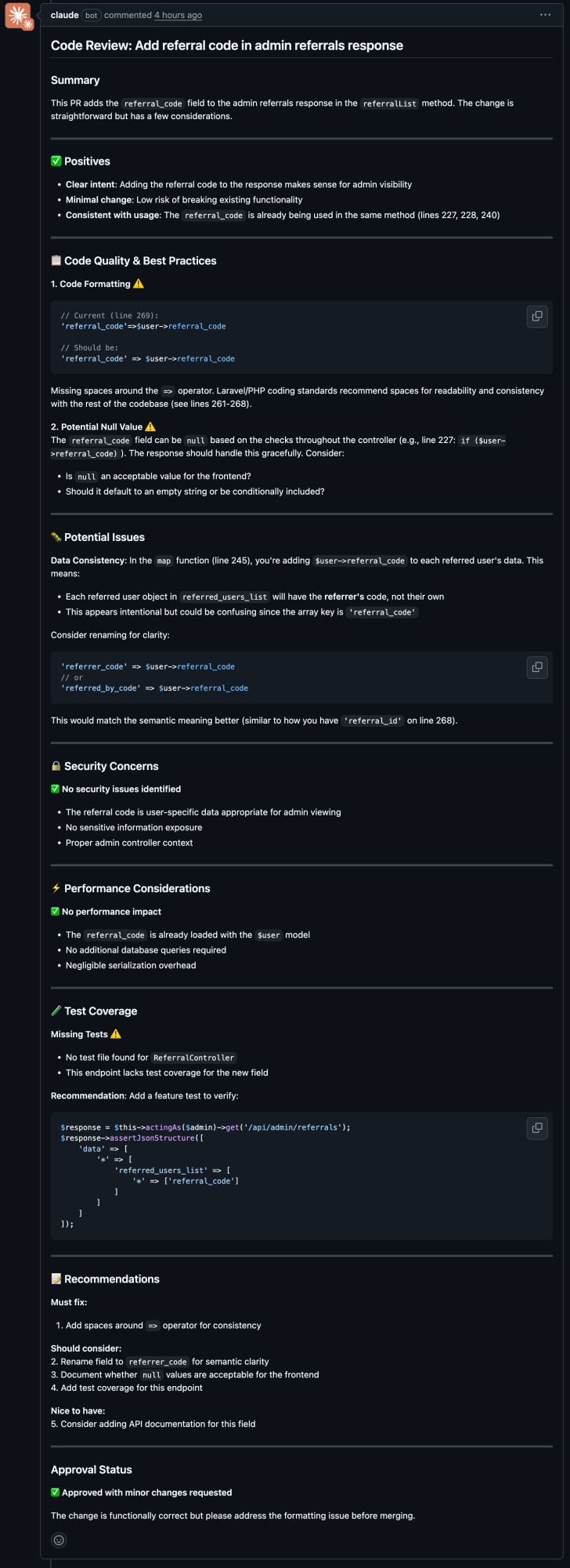 With this prompt, Claude focuses solely on critical issues and provides a concise summary of suggested changes. Combined with limiting it to a single review per pull request, it’s proven to be a valuable time-saver. I’ve found it especially effective in smaller teams, where it helps speed up approvals and catches bugs that might slip past human reviewers. Of course, as with any AI tool, human oversight remains essential. Each flagged issue still needs careful evaluation. After using this setup for about three months, Claude has already helped us catch and fix several bugs before they reached the QA stage.