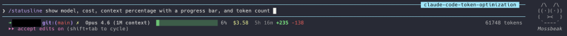 /statuslineenables a persistent bar at the bottom of your terminal that shows your cost, context usage percentage, and session time in real time. No commands to run, just glance down. To set it up, type something like/statusline show model, cost, context percentage with a progress bar, and token count. Describe what you want in plain English, and Claude Code generates the whole thing for you. It appears immediately.