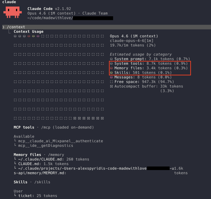 /contextis like the battery usage screen on your phone, but for tokens. It breaks down exactly what's consuming your context: your conversation, plugins, project files, everything. Run it, and you'll immediately see what's eating the most. The example below is a fairly lightweight setup, adding only around 12–13K tokens of overhead. Yours might look very different.