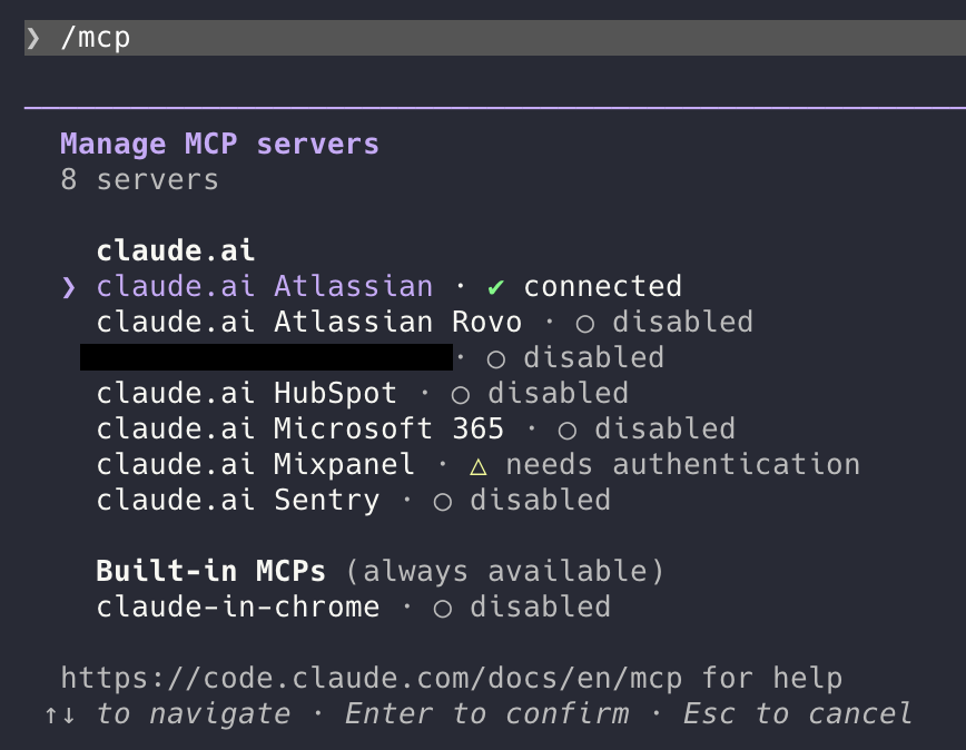 Disable the plugins you don't need for what you're working on right now. You can always re-enable them when you need them. Type /mcp to see all your connected servers and toggle them on or off. Disabled means zero token cost. Servers that need authentication likely consume very little, but disabling them entirely is the safest bet.